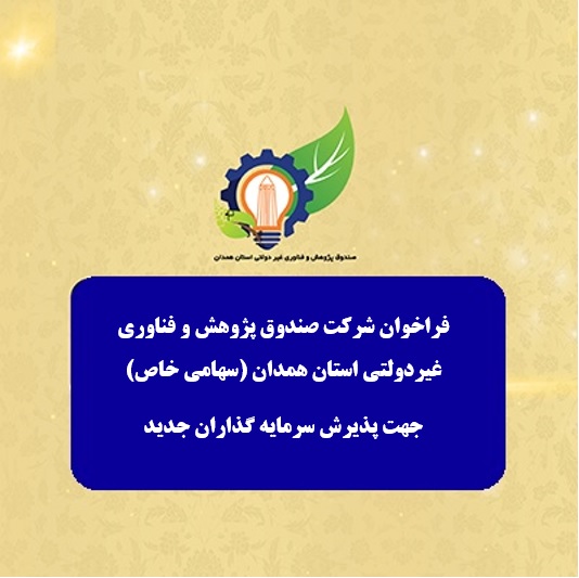 فراخوان شرکت صندوق پژوهش و فناوری غیردولتی استان همدان (سهامی خاص) جهت پذیرش سرمایه گذاران جدیدKhordad.hmrtf۱۵ اسفند ۱۴۰۲
